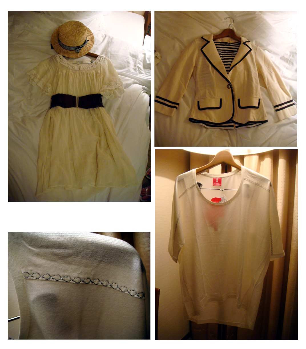 Now to some of my goodies. The top left is the outfit I got at Laforet, complete with the straw hat I got at Shibuya 109. I rationed that this would make a nice breezy outfit for a summer trip! On the right, is a sailor blazer I got at Shibuya 109. Don’t you love the navy blue trimmings? I was waiting for my cousin to try on a dress when I spotted a girl walking pass in this jacket. When K commented that she saw it in a store we’d just been to, I knew I had to have it. The cutting is not that great, but it’s fun and it’s on sale. What’s not to love? At the bottom, is an over sized white t shirt with silver stitching that I spotted at EarthMusic&Ecology. It’s a bit more edgy than the rest of the store, but it was very me. It is currently my favourite item in my wardrobe. It looks super cool paired with shorts or skinny jeans! I also got a lacey breezy cream top from EarthMusic&Ecology (Yes, I did a lot of damage at EarthMusic&Ecology) and a plain white shiny tee shirt from Yecca Vecca. I figured they’d be excellent tops to mix and match with.